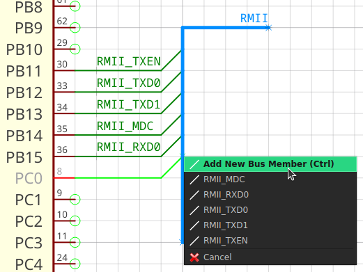 On our user feedback survey, schematic buses are on rank 3 of the most requested features. Now we can remove that feature from the wish list since it has been implemented. All the basic functionlity is there, and more advanced functionality might be provided in upcoming releases. With buses it is possible to group multiple wires in one thick line, called bus, to keep the schematics clean and readable.