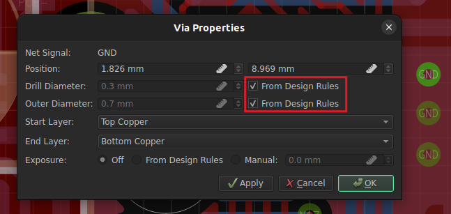 Also noteworthy are some improvements regarding design rules. It is now possible to define the default trace width and via drill diameter in the board settings, so you don’t need to specify those properties anymore when adding traces and vias to the board. And thanks to the automatic via annular ring calculation, you never have to worry about outer via sizes anymore!